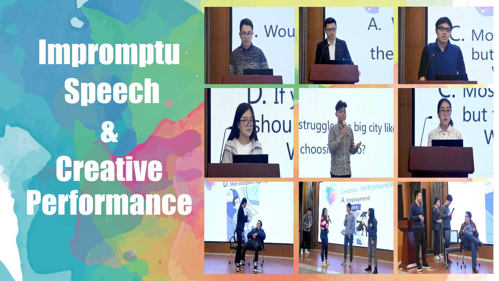 本次比賽共設(shè)“自命題演講”、“即興演講”和“創(chuàng)意表演”三個(gè)環(huán)節(jié),“自命題演講”的主題為“改革開放40周年”。根據(jù)比賽環(huán)節(jié)的設(shè)置,每位參賽選手不僅需要熟記文稿,還需要在現(xiàn)場(chǎng)靈活發(fā)揮。大家在舞臺(tái)上充分展現(xiàn)了自己的英語風(fēng)采,給評(píng)委和觀眾留下了深刻的印象。