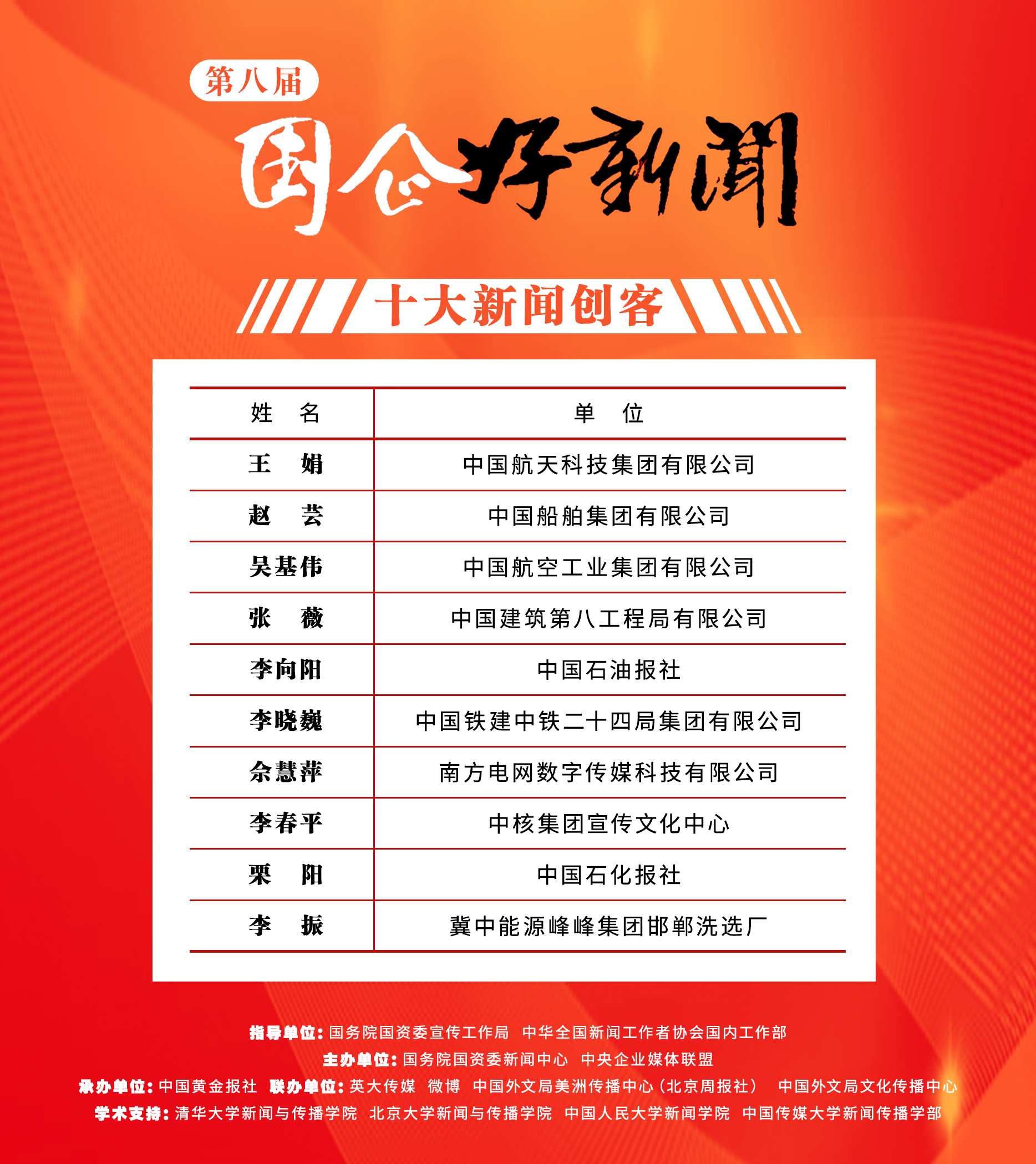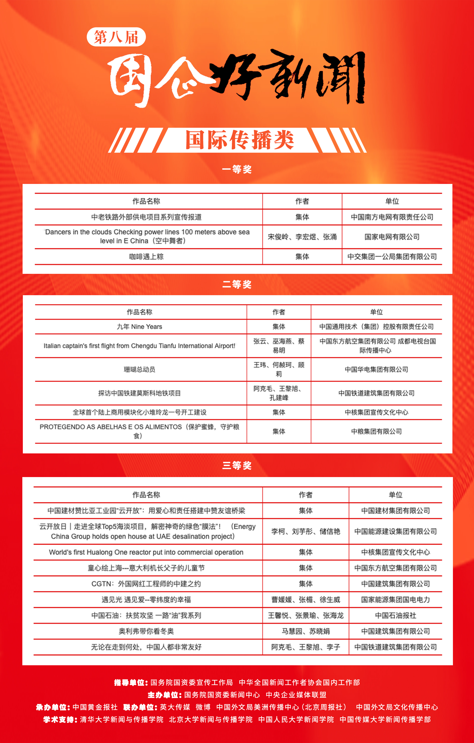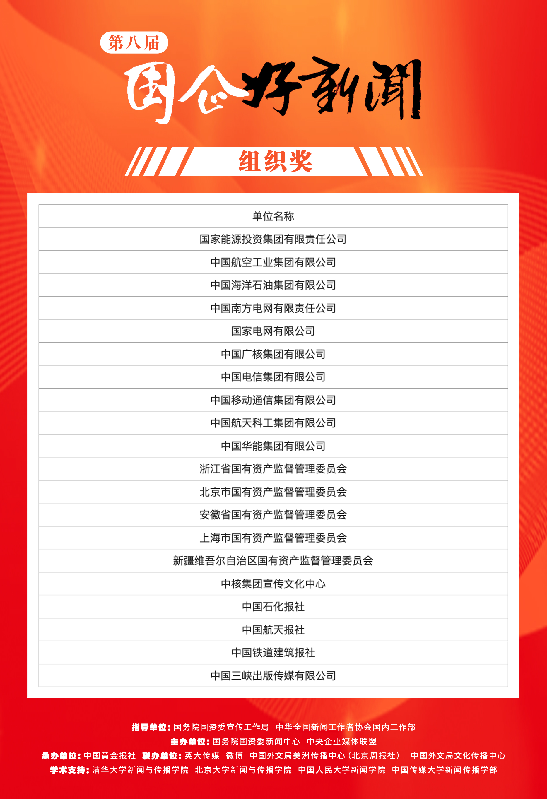 在國資委黨委的高度重視下,第八屆“國企好新聞”由國務院國資委宣傳工作局、中華全國新聞工作者協會國內工作部指導,國務院國資委新聞中心、中央企業媒體聯盟主辦,中國黃金報社承辦,英大傳媒、微博、中國外文局美洲傳播中心(北京周報社)、中國外文局文化傳播中心聯辦,清華大學新聞與傳播學院、北京大學新聞與傳播學院、中國人民大學新聞學院、中國傳媒大學新聞傳播學部提供學術支持。征集、評選歷時2個月,得到了國資國企、主流媒體、社會公眾的廣泛關注和積極參與,3772件新聞作品、73名新聞創客人選參評,138家國資國企單位報名,相比往屆量質齊升,社會影響力顯著增強。