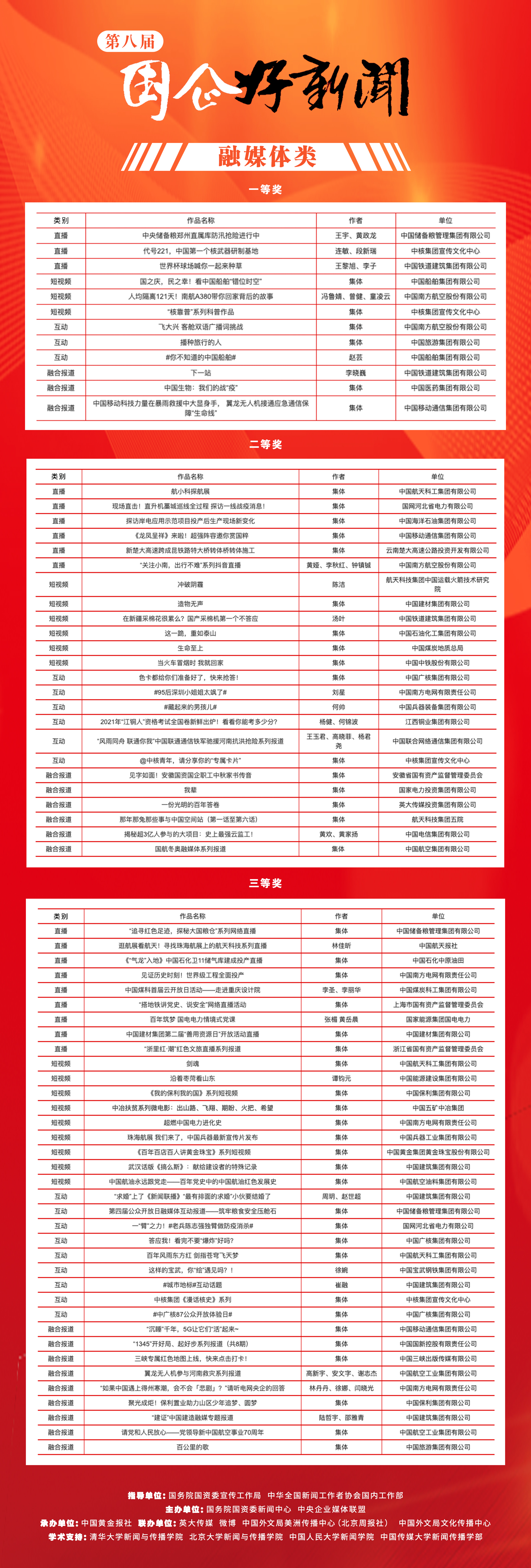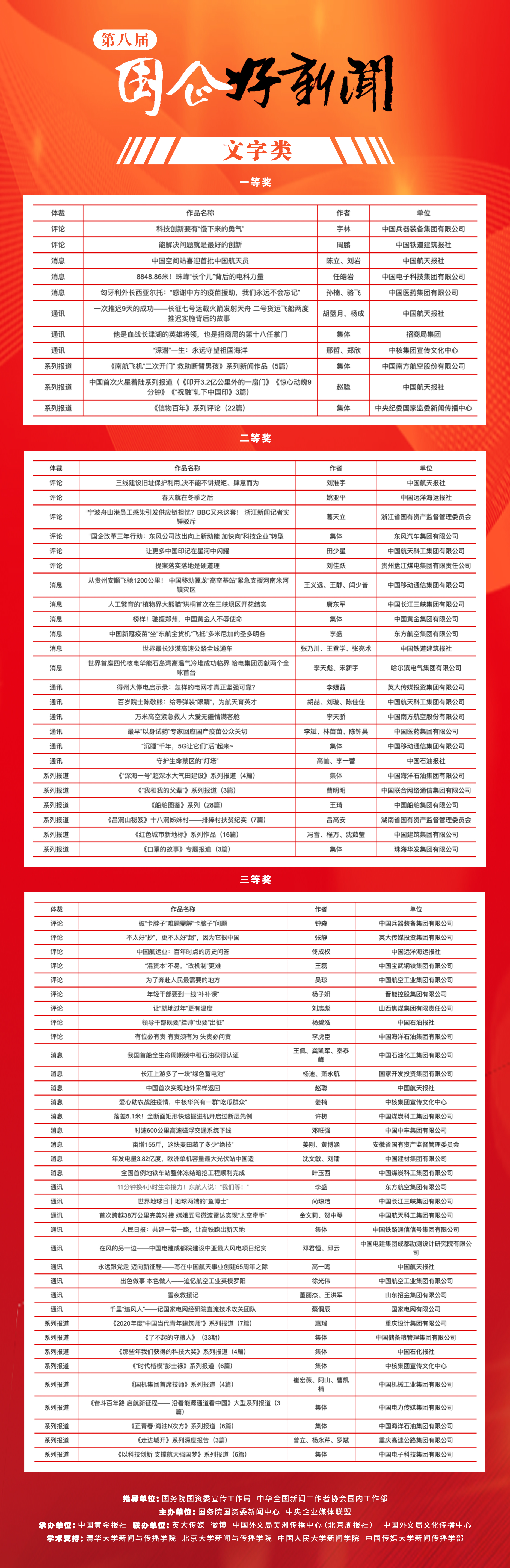 1月11日,第八屆“國企好新聞”推介歷經單位推薦(自評)、專家復評、終評、公示等環節,3772件申報作品中,227件精品榮膺“國企好新聞”。其中,一等獎32件、二等獎66件、三等獎99件,優秀獎20件,專家評委會還給予主流媒體的10篇精品力作“特別獎”;20個單位獲得組織獎,5個單位榮獲突出貢獻獎,10名新聞創客從73位申報者中脫穎而出,為國資國企宣傳隊伍和主流媒體搭建交流、對標平臺,匯聚國資正能量、傳播國企好聲音。這些“國企好新聞”作品,生動地再現了極不平凡的2021年國企改革發展黨建,清晰地勾勒了可親可愛可敬的新國企形象。