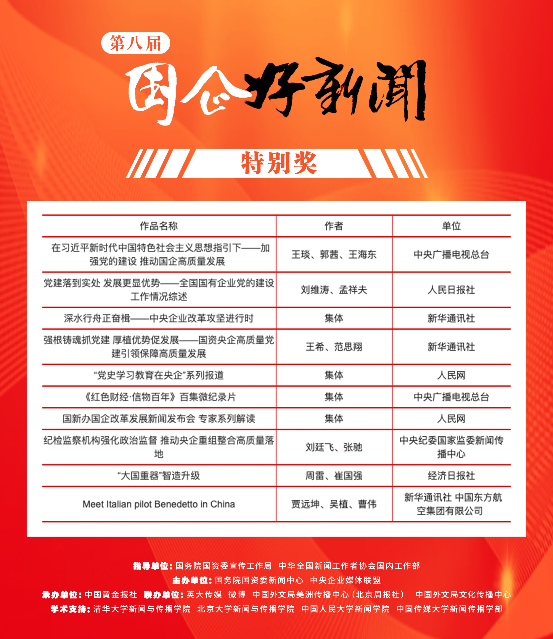 四是評選過程的“權威性”。本屆“國企好新聞”邀請政企媒學各界權威人士擔任專家評委,包括中央部委有關部門負責人,中國社科院、清華大學、北京大學、中國人民大學、中國傳媒大學、復旦大學等高校研究機構專家學者,人民日報、新華社、中央廣播電視總臺、經濟日報、中國日報以及新浪微博等媒體平臺代表;通過專家線上打分、線下分組評審、集中合議,得出最終評審結果。作為承辦方,中國黃金報社黨委書記、社長陶明浩表示,經過優中選優、精中選精的評選過程,獲獎作品堪稱最澎湃的“國資正能量”、最響亮的“國企好聲音”。作為平臺代表,微博政務運營總經理李崢嶸表示,微博將落實平臺主體責任,發揮社交媒體的力量傳播精彩故事、開展網友互動,與國資國企一起塑造良好品牌形象。